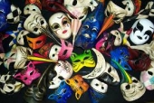 様々な色と種類の仮面があり、シンプルに目を隠すのみの仮面や、顔面全体を覆うもの、またくちばしのある仮面はペストが流行った時代に使用されたもの。
