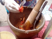 屋台ではこのグロックをいちいち洗ったりせず、次から次へと新しい具材を入れて次のオーダーに対応します。このため前の人が頼んだソムタムの残りが新たに頼んだソムタムに混じる可能性が高く、前にソムタムプーを頼んだ人がいれば、その後数個のオーダーにはこのソムタムプーの水分が必ず混じっているからです。レストランやフードコートではソムタムプー用とそれ以外のソムタムでグロックを分けていることが多いので比較的安全という訳です。